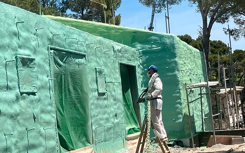 Aislamiento térmico con poliuretano proyectado que mejora la eficiencia energética de la edificación y el confort interior en fachadas y cerramientos.